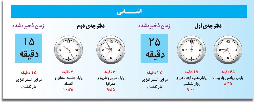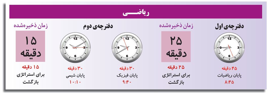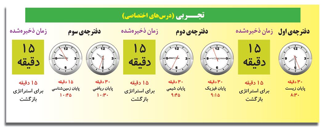 امسال در کنکور تجربی سه دفترچه و در کنکور ریاضی و انسانی دو دفترچه خواهید داشت ، بنابراین شما می توانید خیلی بهتر و موثرتر زمان را مدیریت کنید و وقت کم نیاورید.